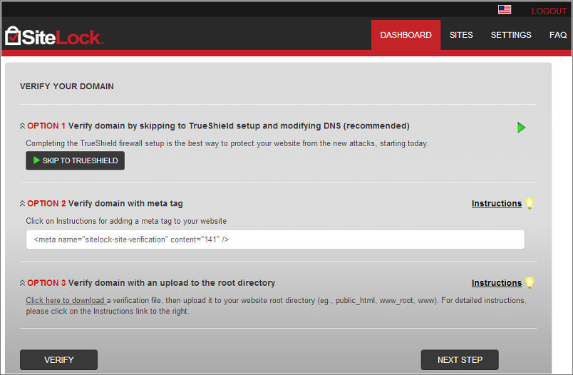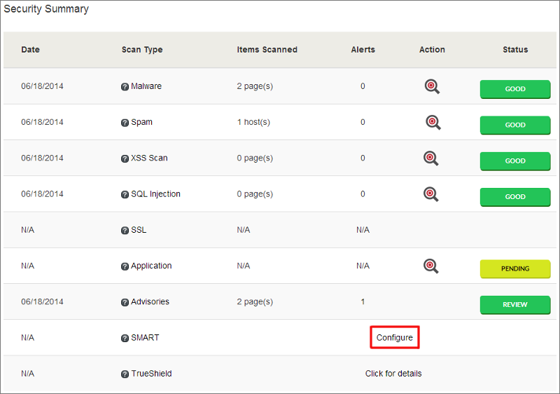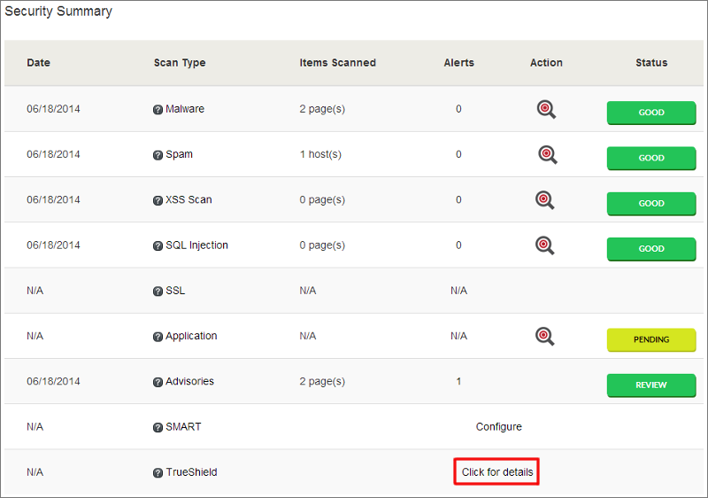 In order to block bad traffic and increase your website speed, it is recommended that you configure TrueShield Firewall / TrueSpeed CDN for your website. This can be done through the TrueShield details link in the Security Summary section on your Dashboard.