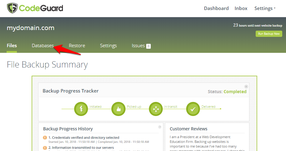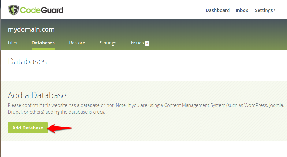 Visit the CodeGuard dashboard, as explained above in the process for adding a website. Click on the Databases tab.