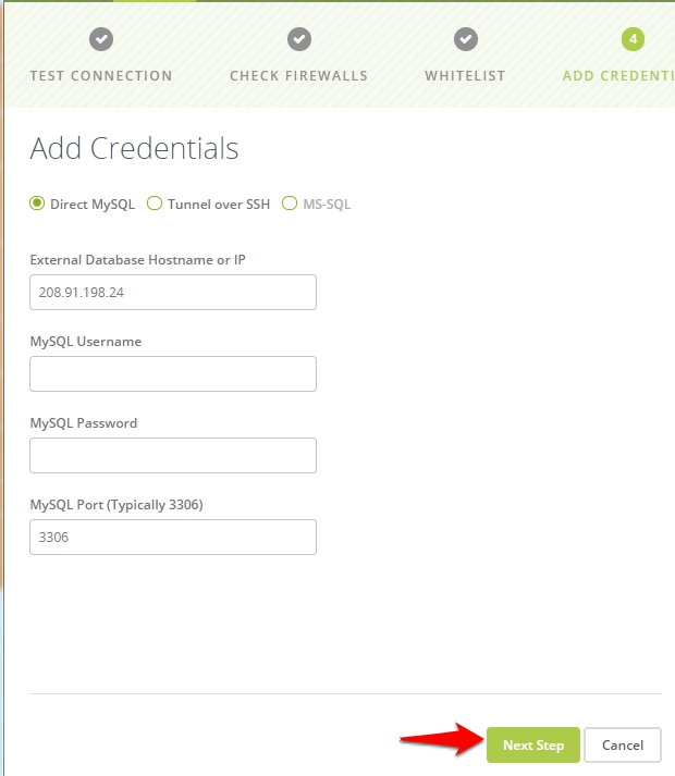 - Enter the database username and password for the database you want to connect with CodeGuard. Click Next Step to proceed.