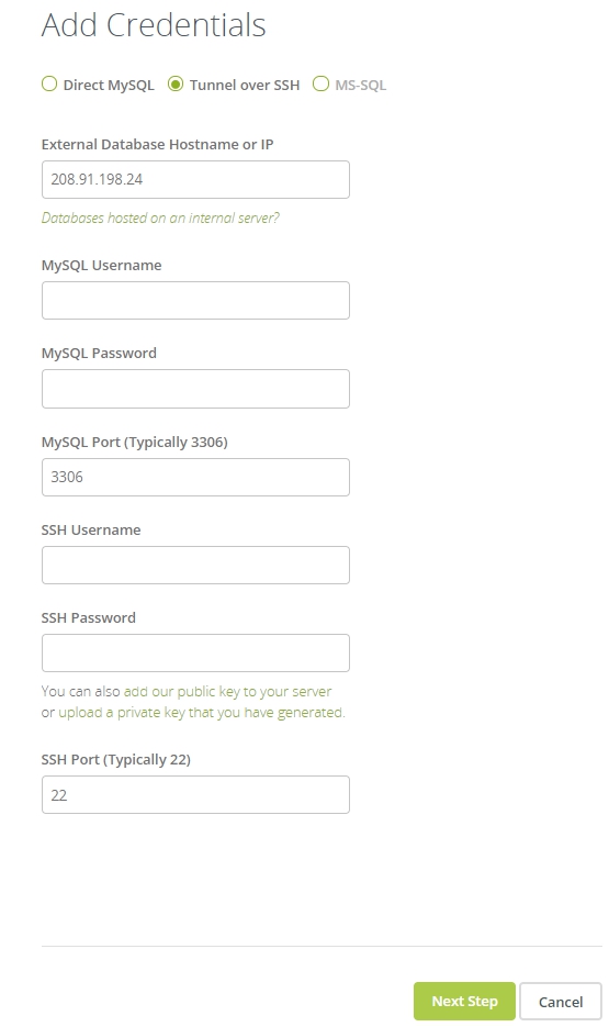 If SSH has been enabled for your hosting account, you can connect to the database over SSH. Here, choose the Tunnel over SSH option.