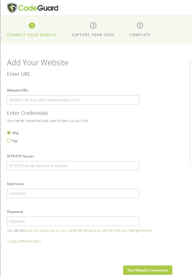 You will be required to add your website FTP details, if you are logging in to the CodeGuard dashboard for the first time. If you have the FTP details, proceed to step 4 directly.