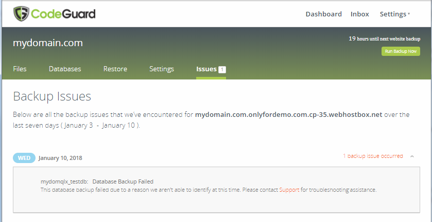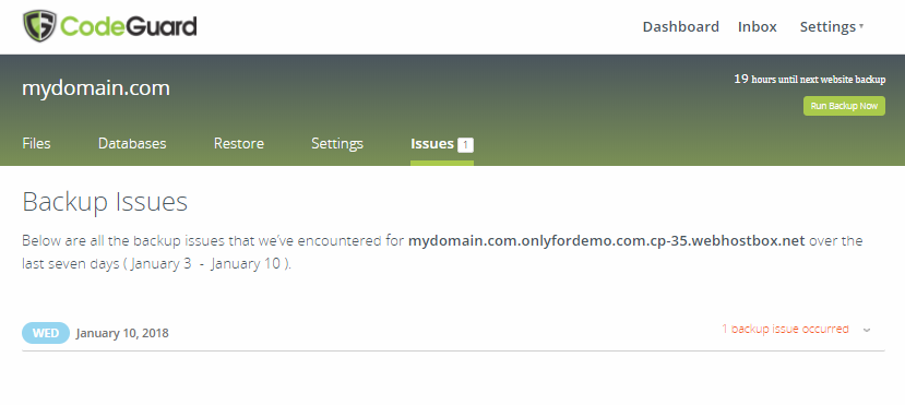 In the CodeGuard dashboard, click on the Issues tab to bring up the Backup Issues interface: