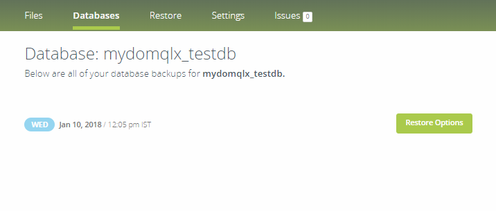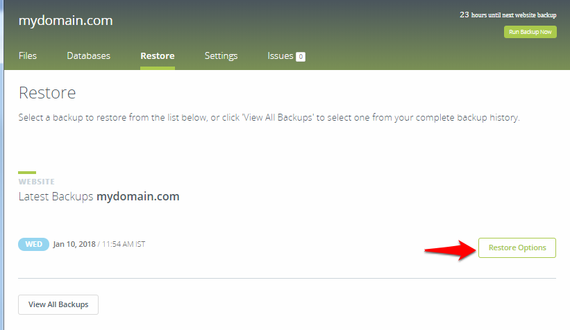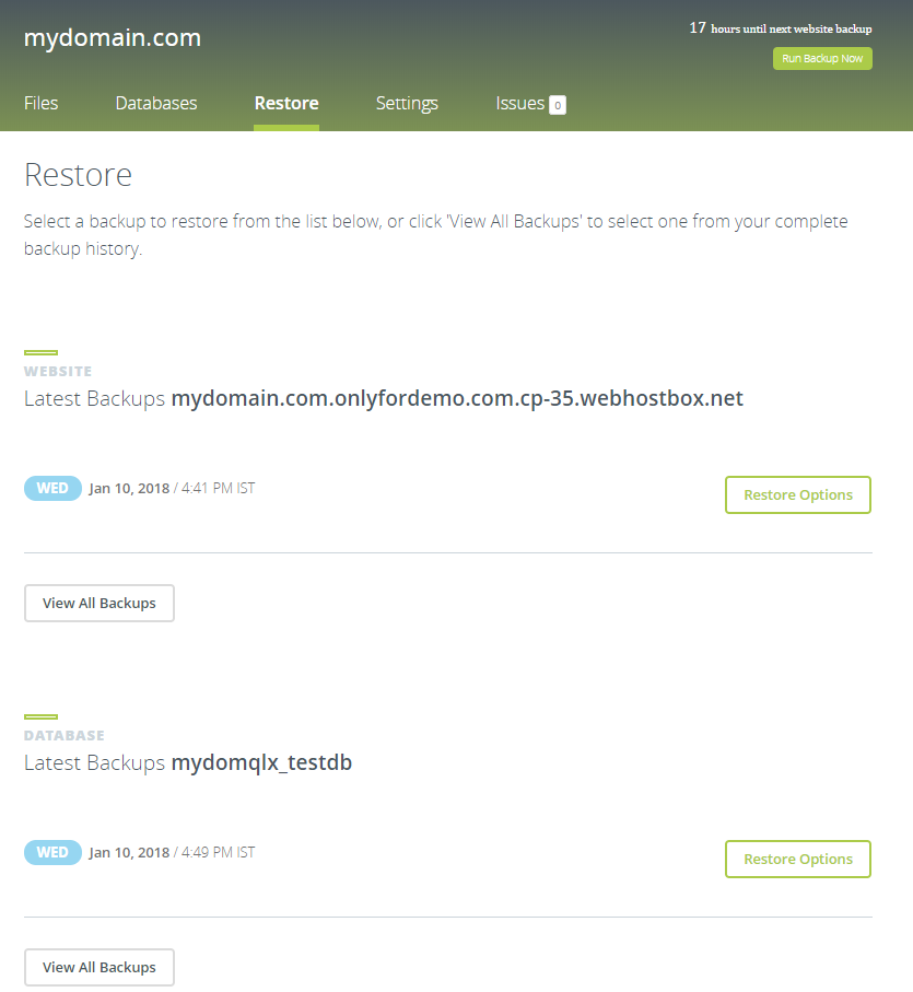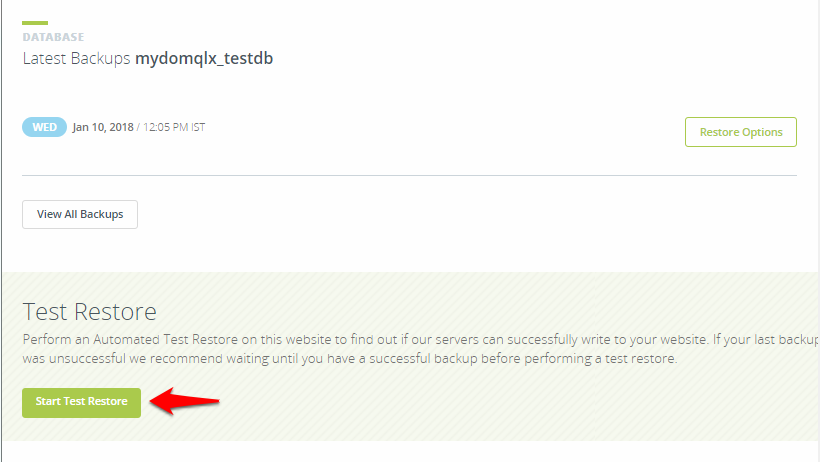 In the website / database specific view that follows, click on the View All button to view the backup history interface: