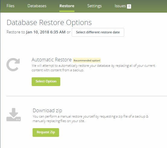 Download Zip: Perform a manual restore yourself by requesting a zip file of a backup & manually replacing files on your site