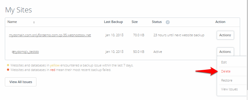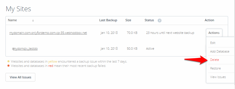 If required, you can delete a website or database through the Delete option under the ACTION menu, corresponding to the website or database.