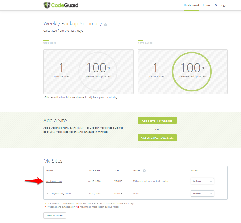 In the CodeGuard dashboard, click on the website or the database link under My Sites.