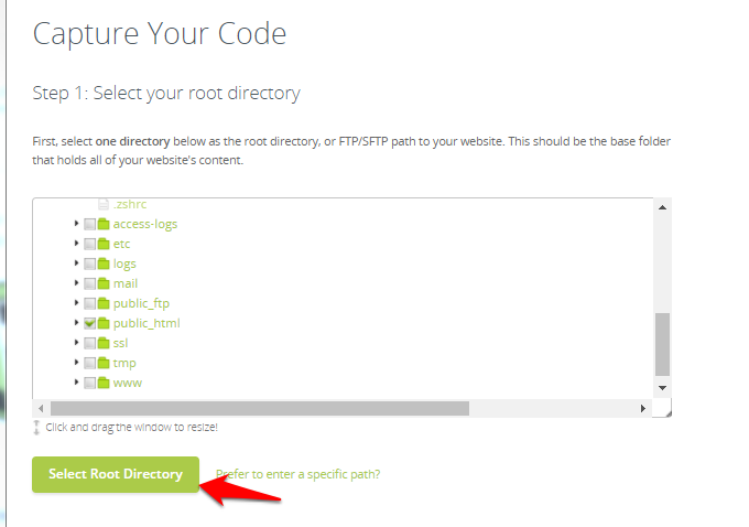 On a successful connection, you will see the screen shown below. Select the root directory of your website and click on the Select Root Directory button to proceed.