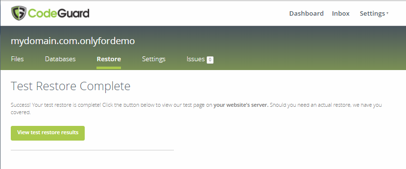 You can perform an automated test restore on your website to find out if CodeGuard can successfully write to your website, by clicking the Start Test Restore button.