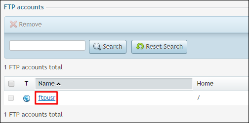 Under the FTP accounts section, click the FTP user link for an existing FTP user.