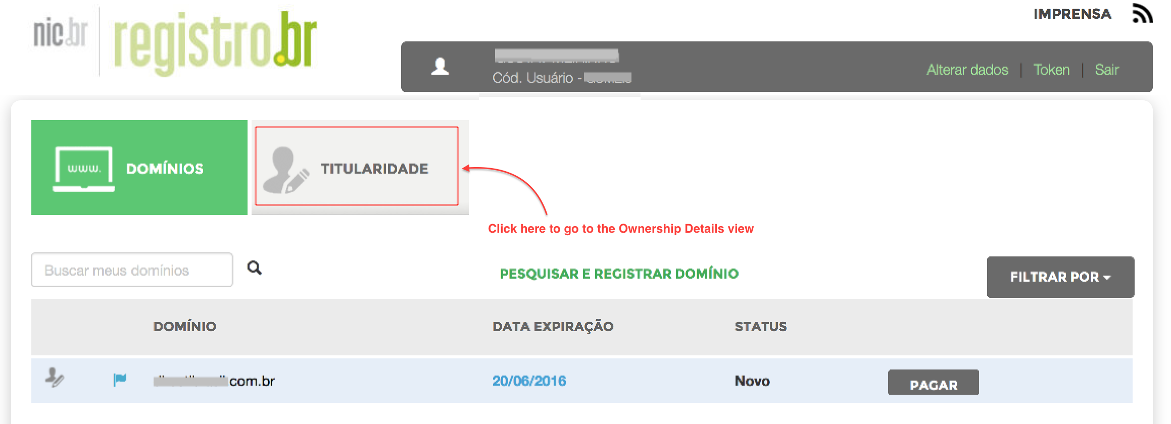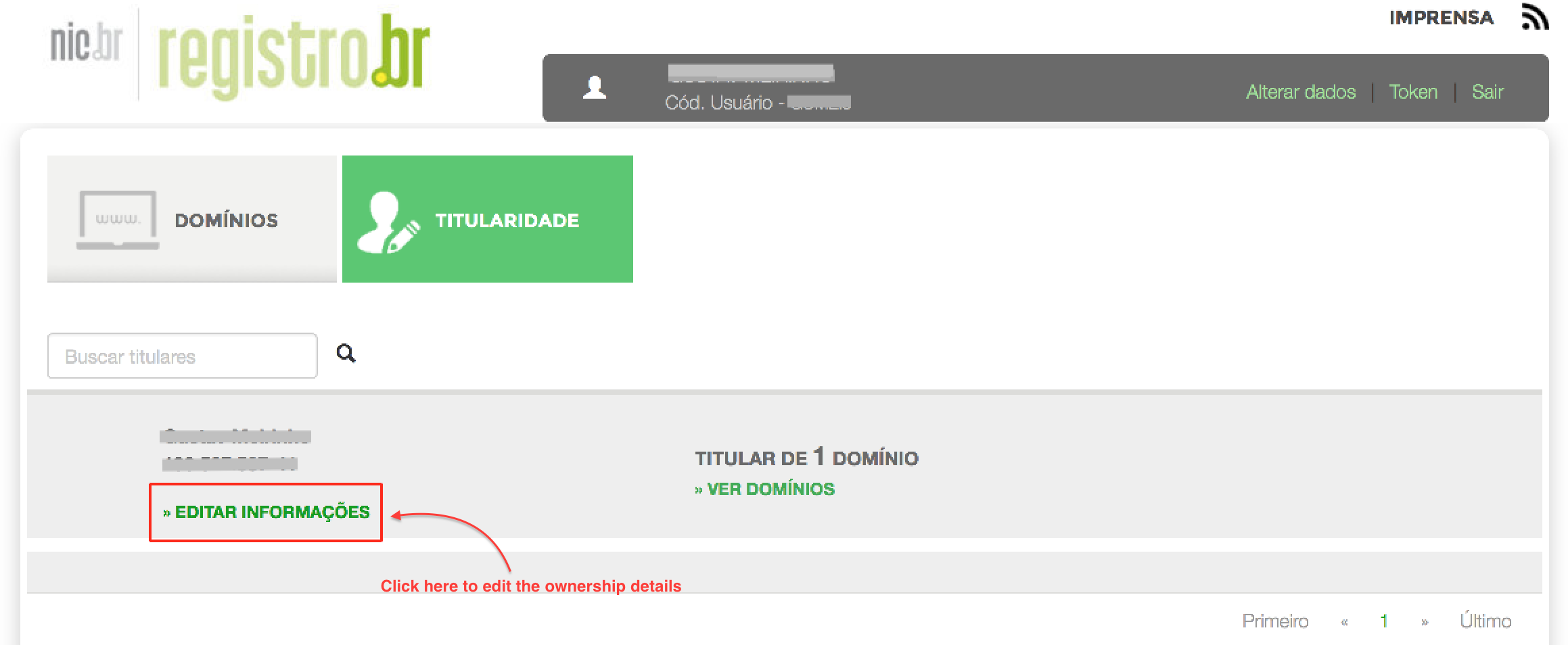 Once logged in, click on TITULARIDADE to go to the ownership details view.