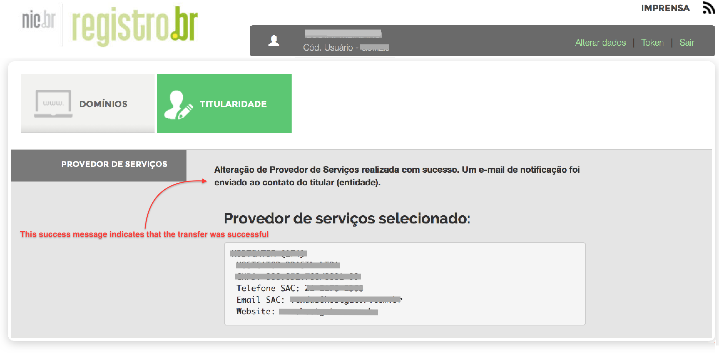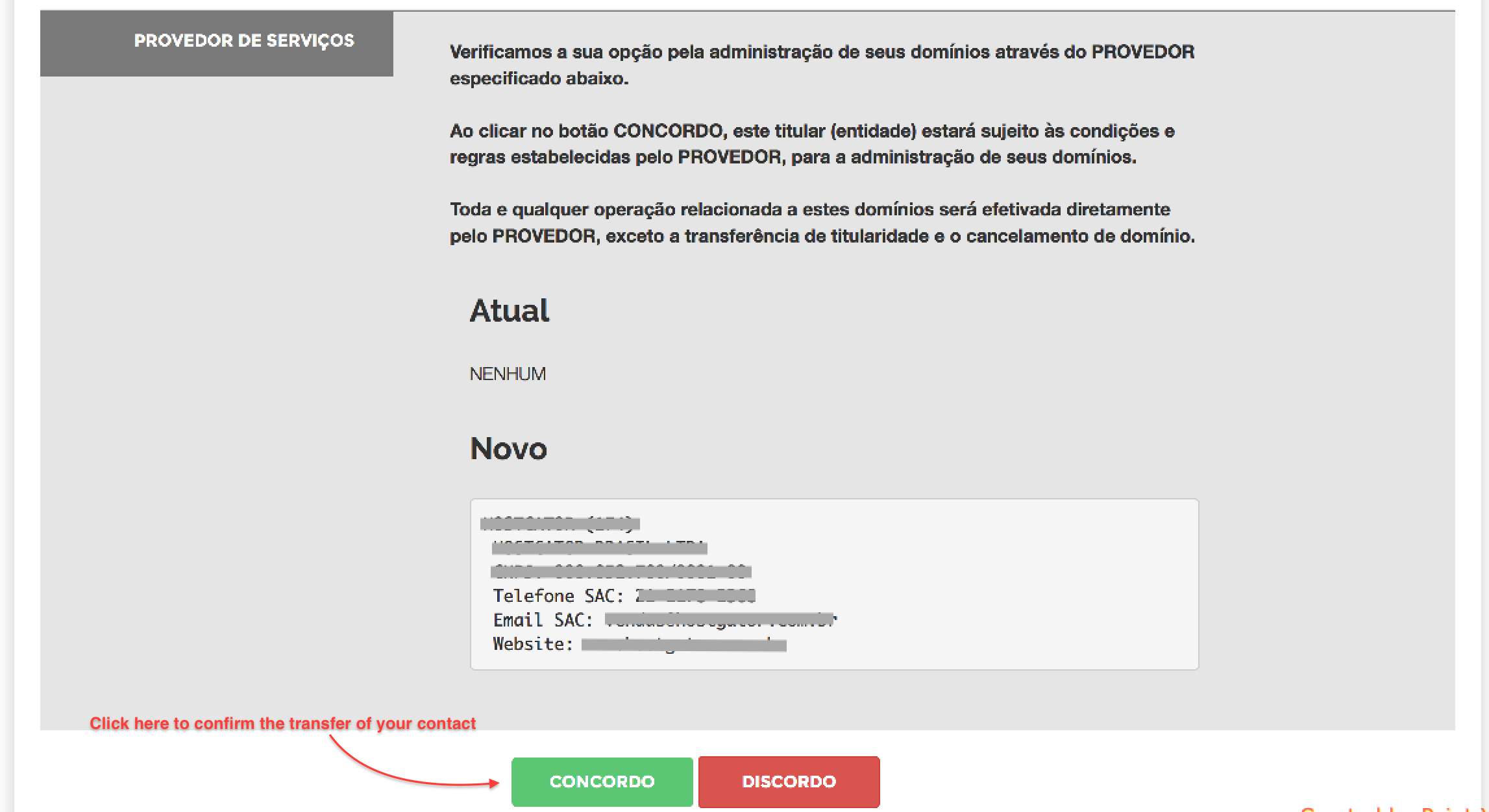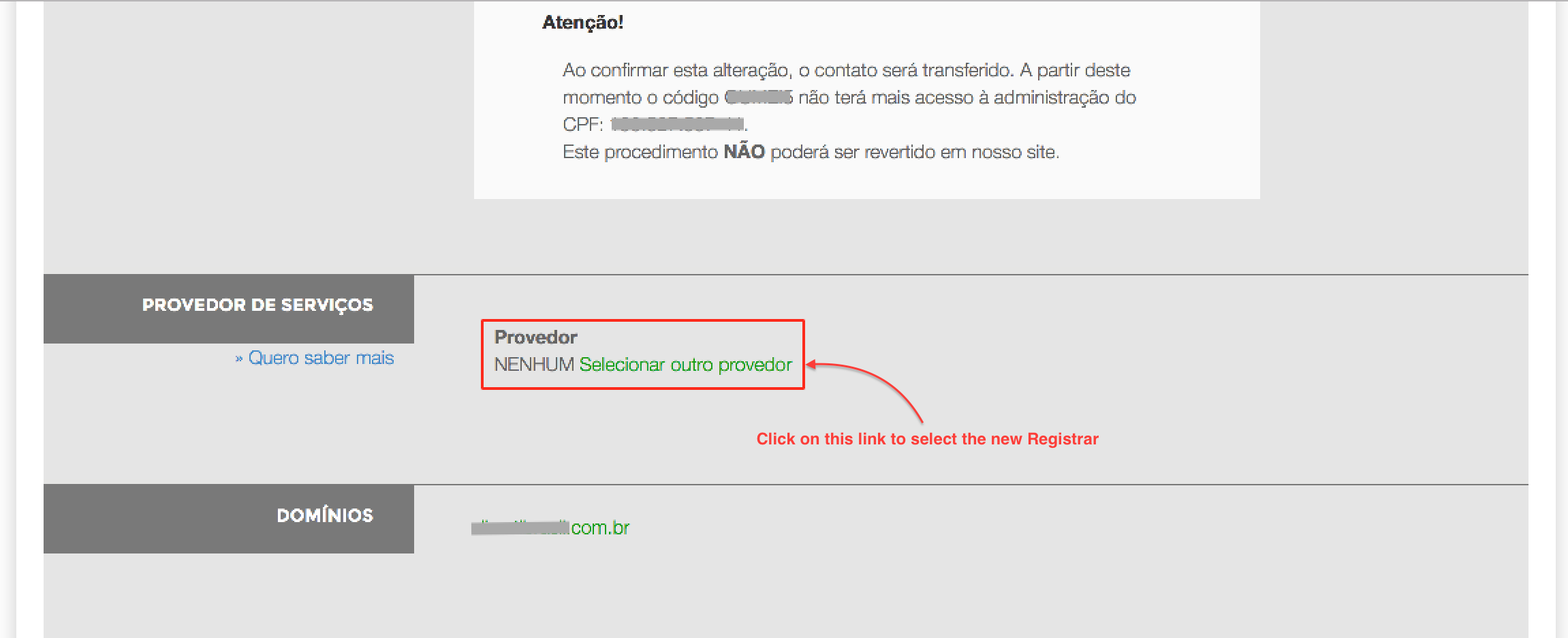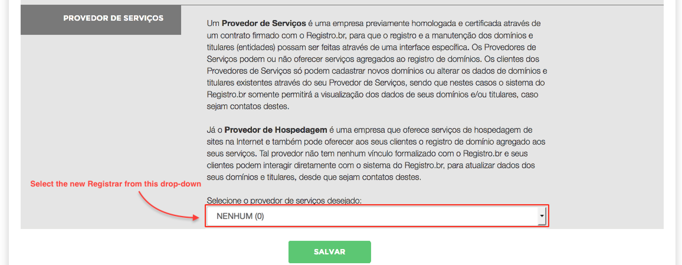 On this page, scroll down to the PROVEDOR DE SERVIÇOS section, where you can select the new Registrar.