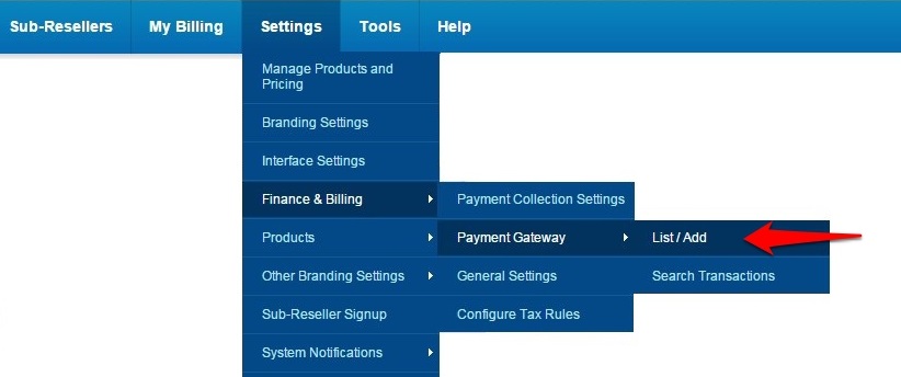 • Click on Setting > Finance & Billing > Payment Gateway > List/Add