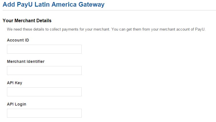 You will need to sign up for a Merchant account at PayU Latin America and obtain the PayU AccountID, Merchant Identifier, API Key and API Login.