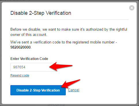 Enter the verification code sent to your phone number in the provided field and click on Disable 2-Step Verification.