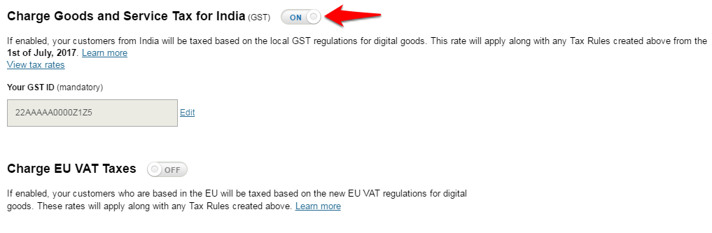 Click on the ON / OFF toggle next to Charge Goods and Service Tax for India to disable GST.