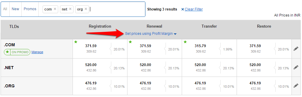 With the bulk pricing tool, you can do a bulk search for the TLDs, specify your profit margin and the system will calculate and set your selling prices accordingly.